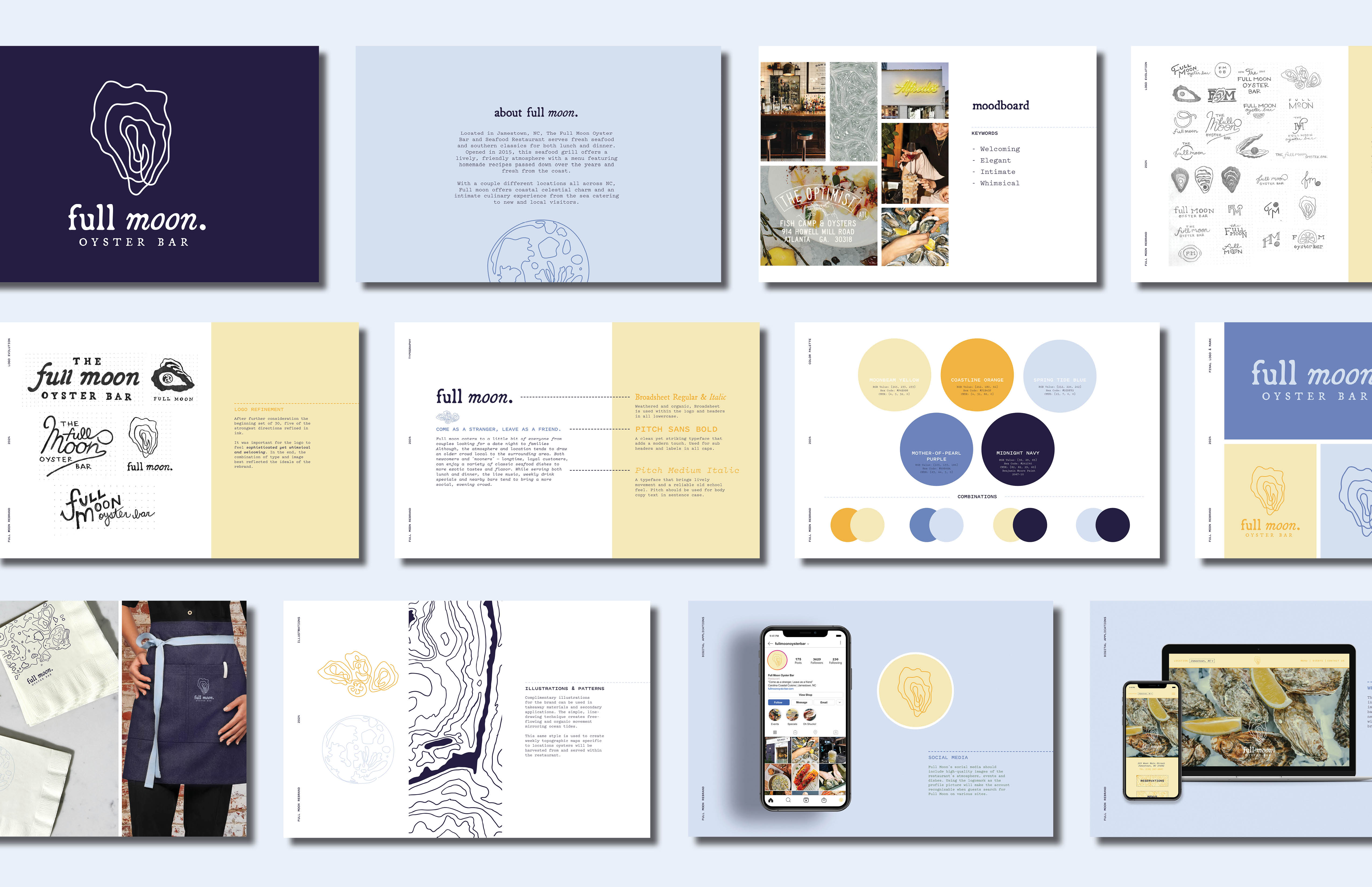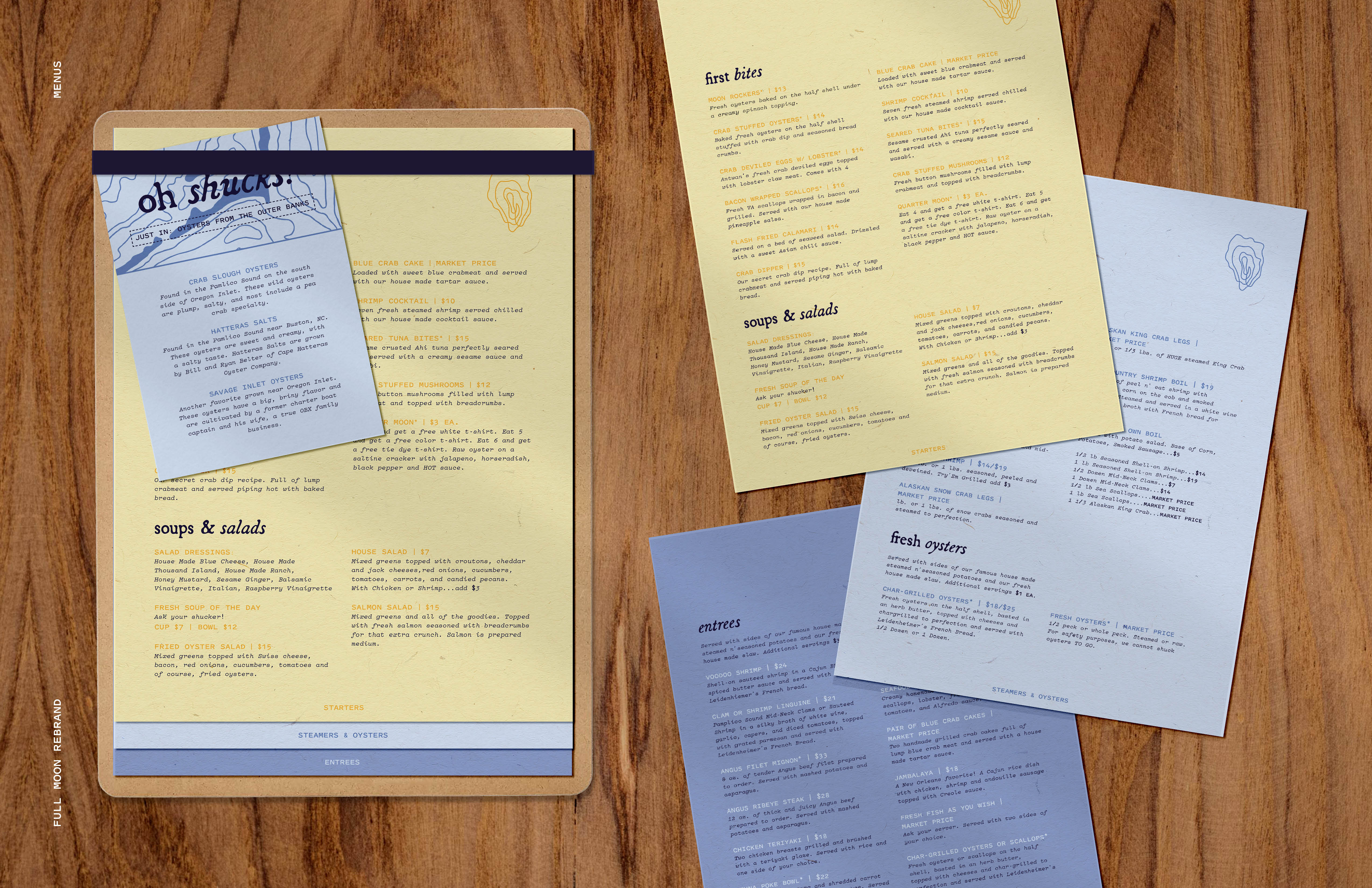 The Full Moon rebrand concept captures their lively, intimate atmosphere and elevate it within a clear and consistent identity as well as, tie in their roots of the carolina coasts. The rebrand attracts a younger crowd while still catering to long time customers and create alluring presence to compete wit restaurants in the surrounding area.