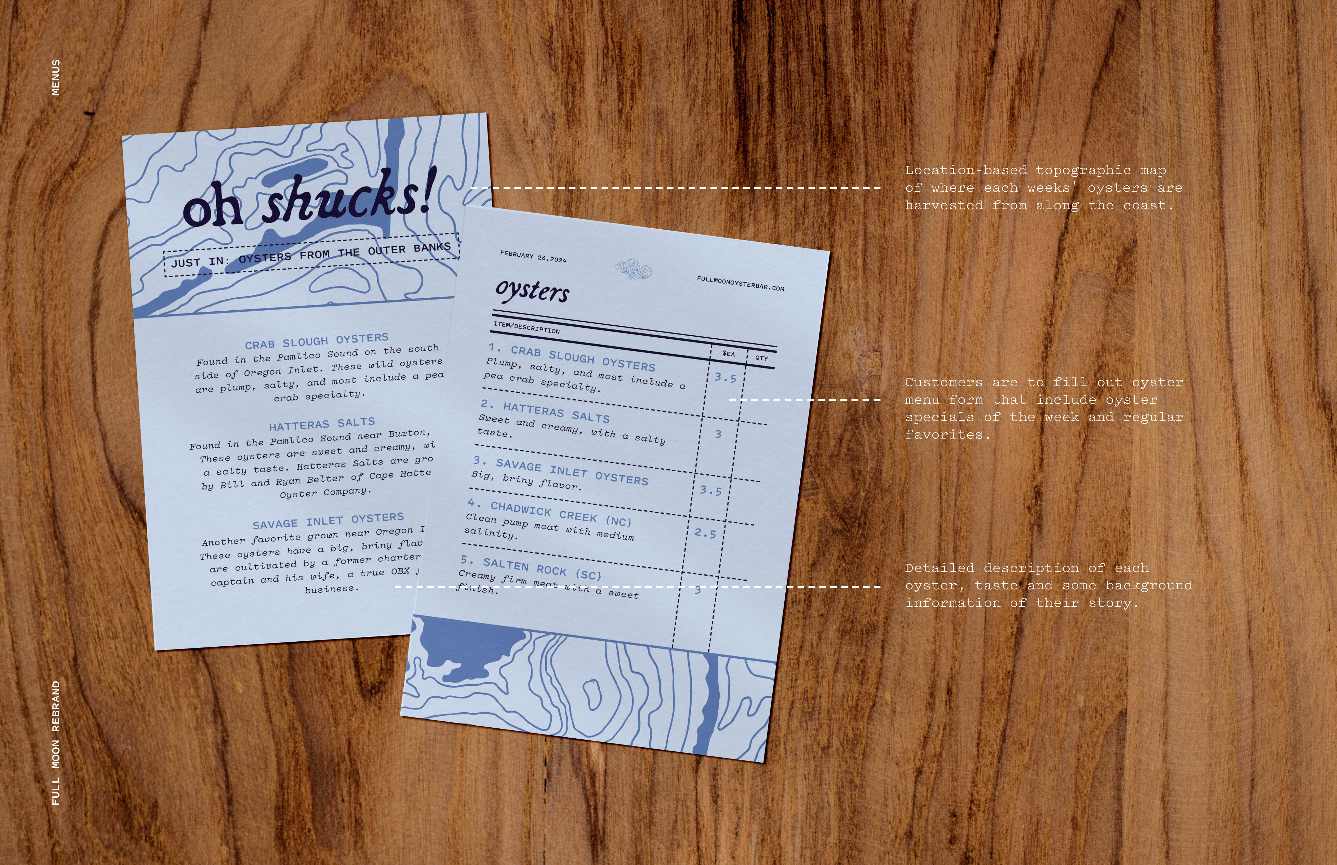 The color palette and line drawing illustrations create flowing and organic movement, mirroring ocean tides and coastal evenings. This same style is used to create weekly topographic maps specific to locations’ oysters will be harvested from and served within the restaurant.
